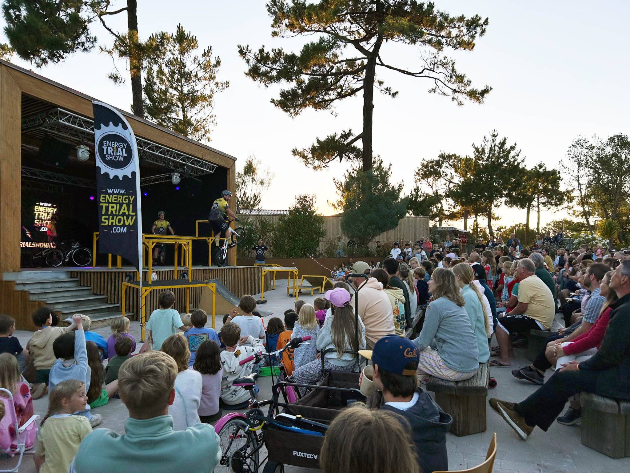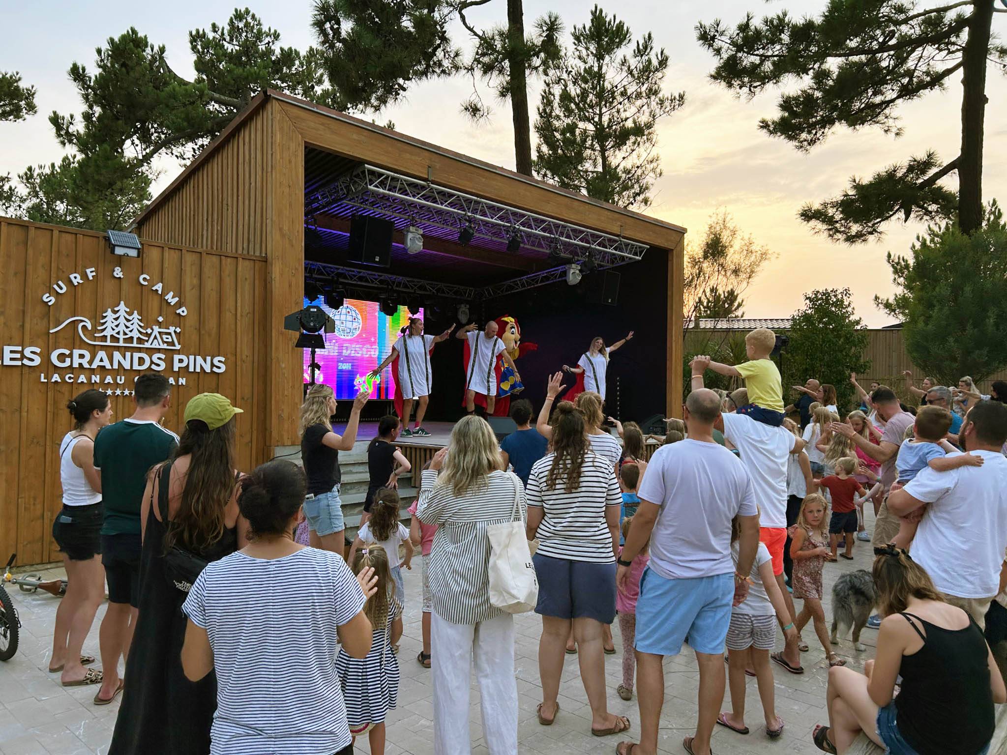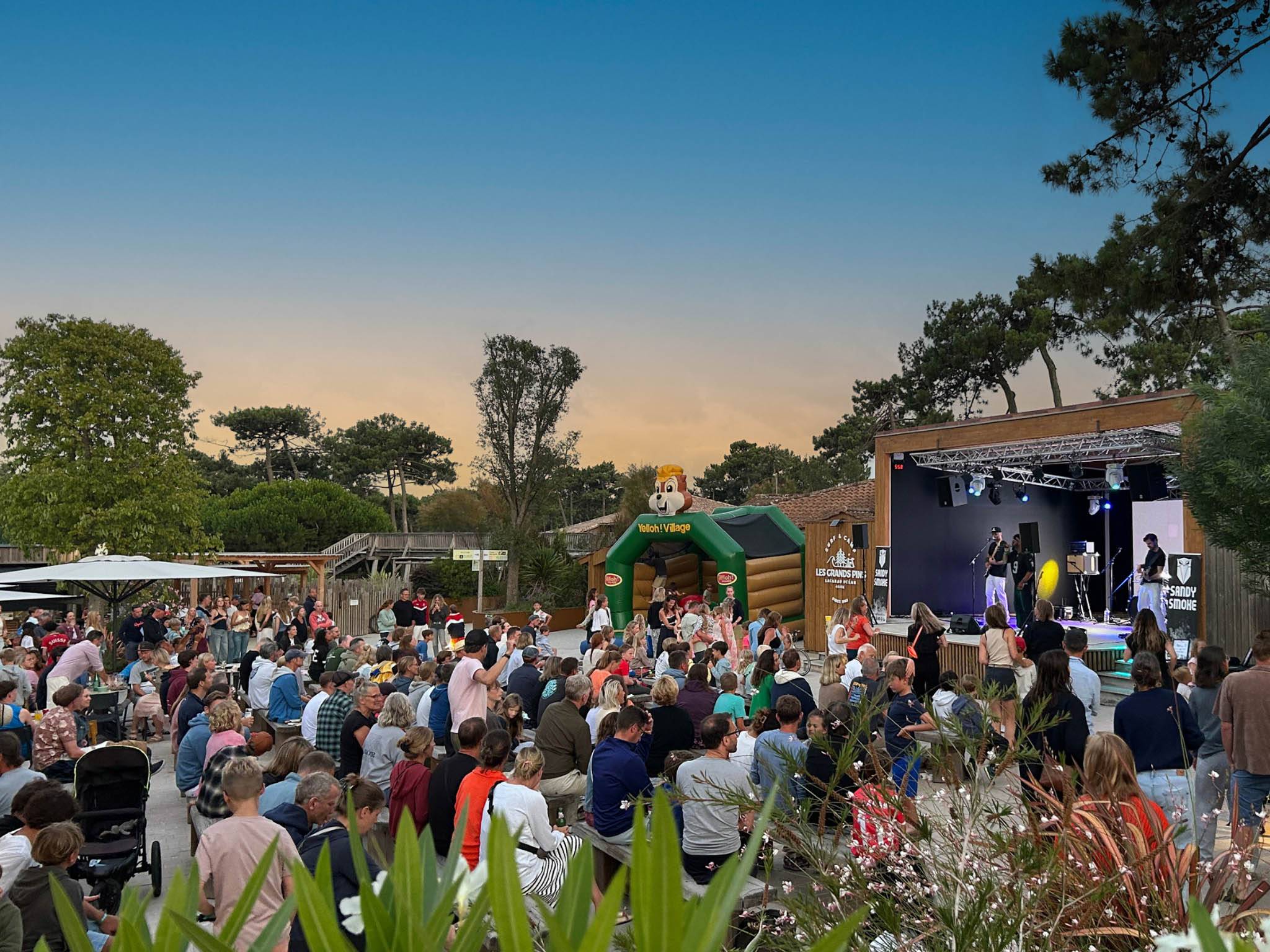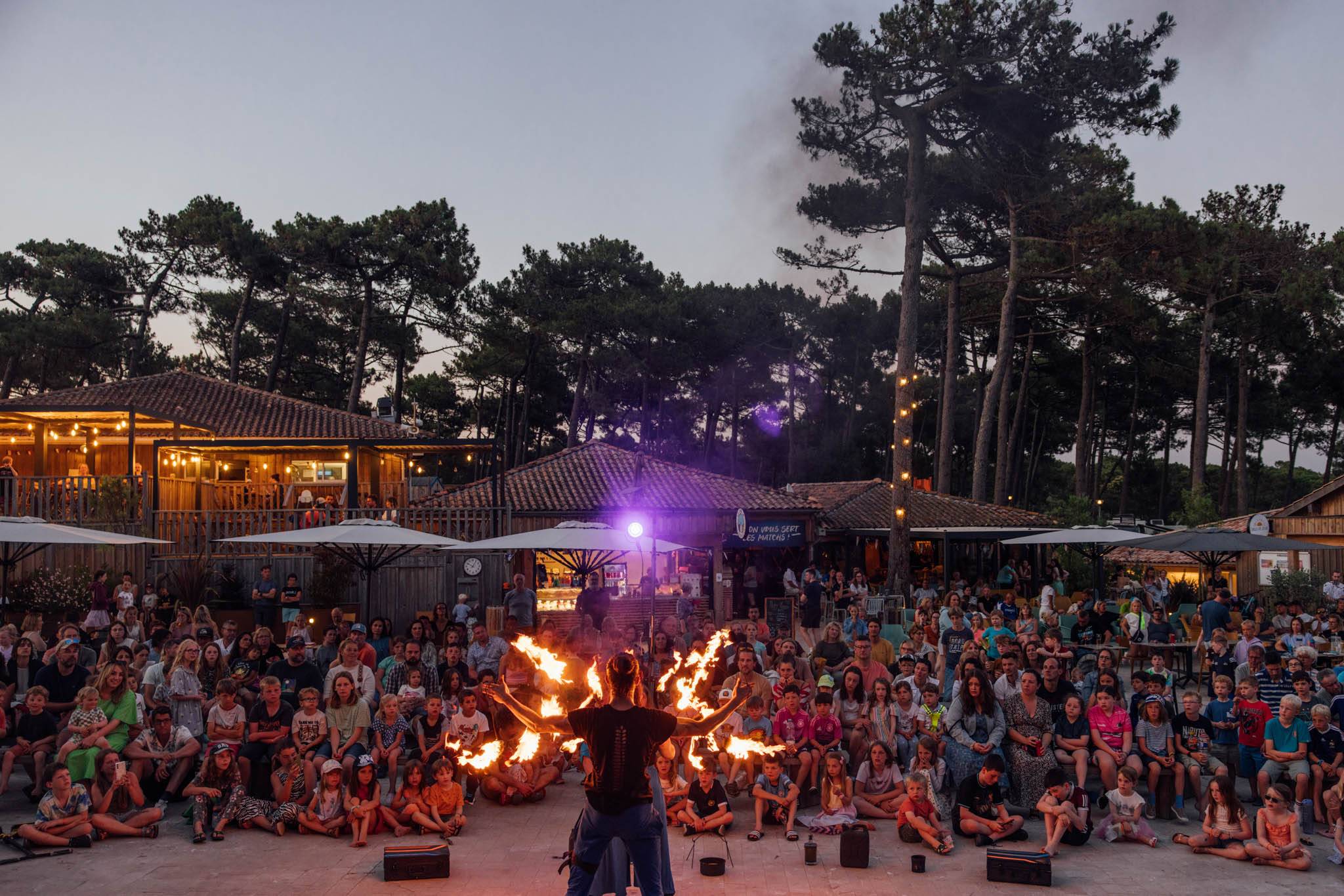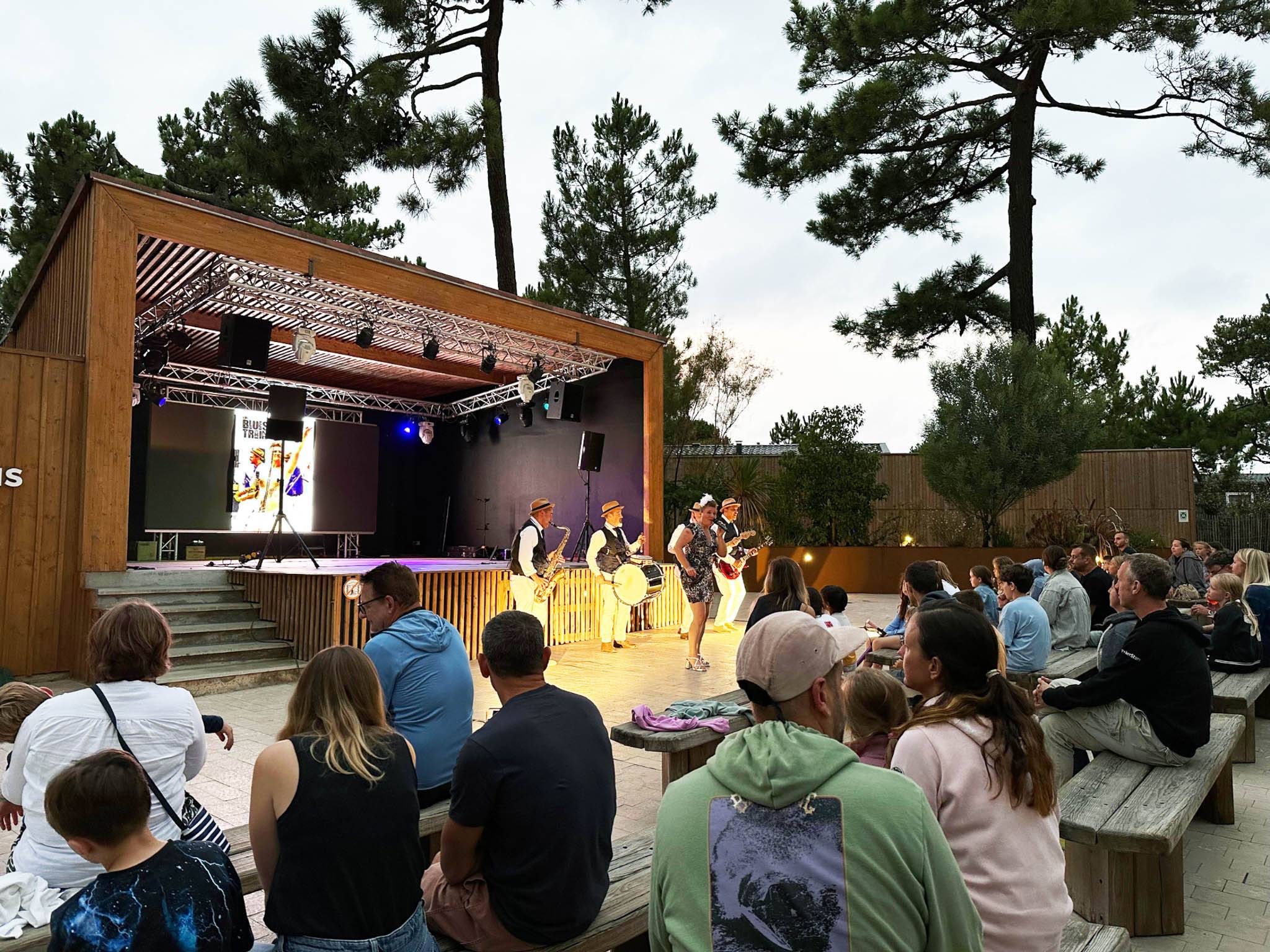 Wanneer de zon achter het dennenbos verdwijnt, verandert de sfeer in Les Grands Pins: het podium wordt verlicht, de muziek klinkt en het dorpsplein komt tot leven.